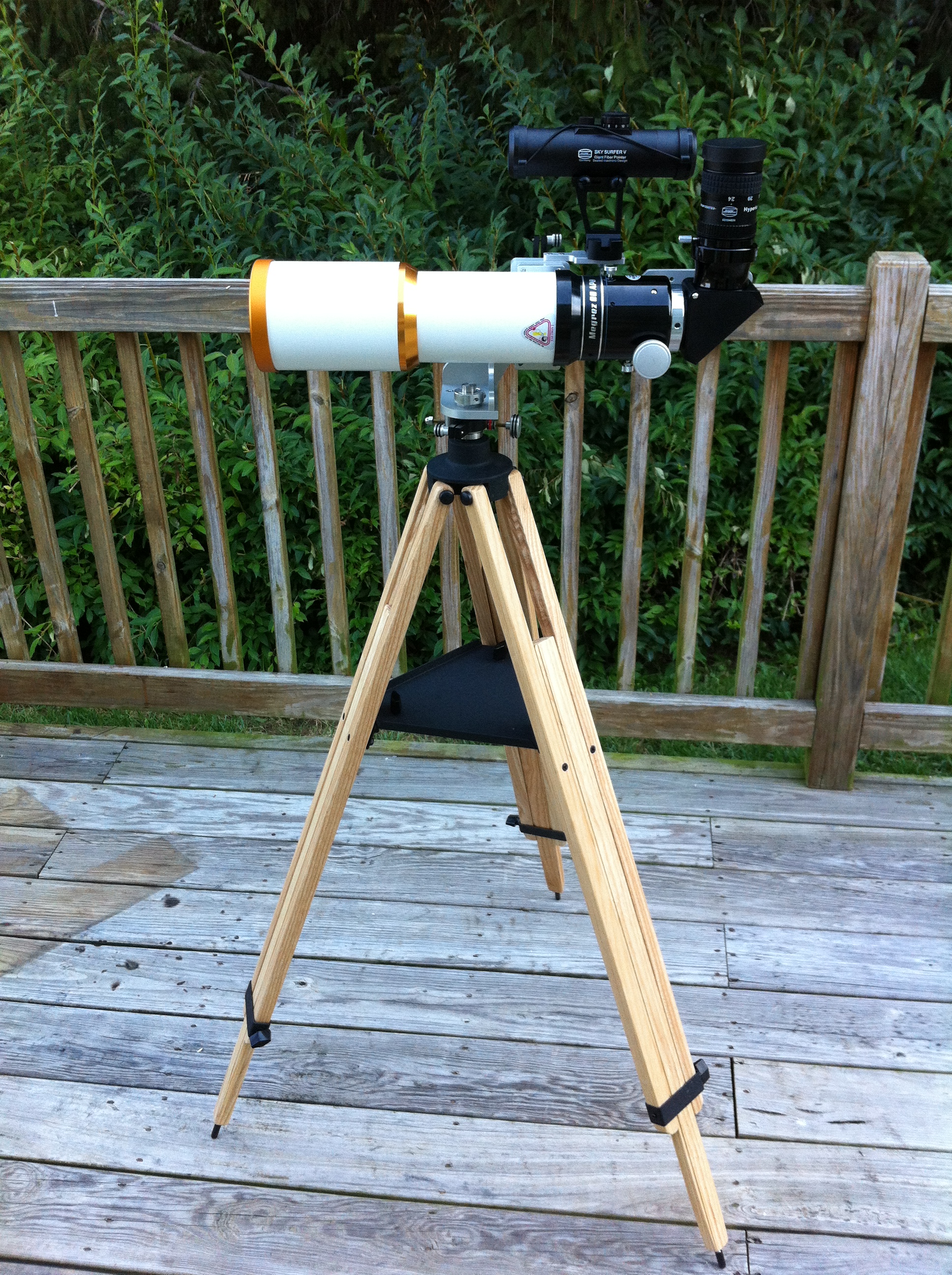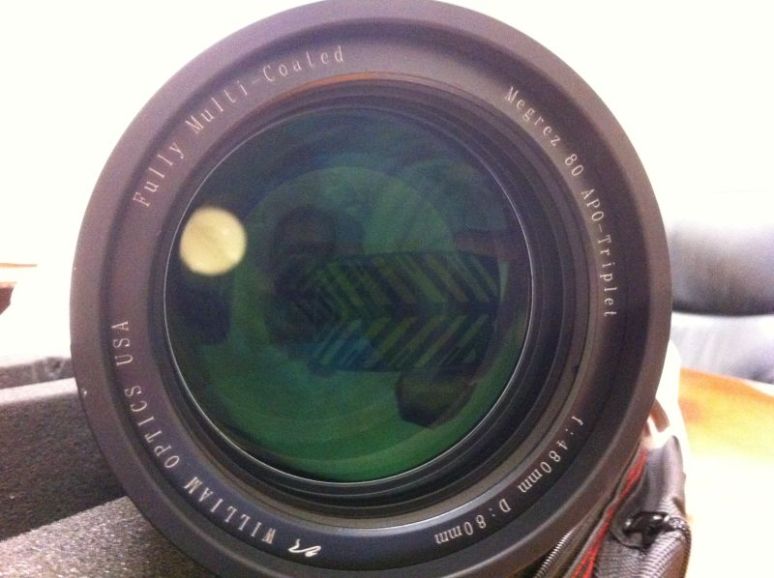 So, I went with the nice, low-tech approach for this one. I wanted to be able to go out on my back porch and just start observing, which is exactly what this kind of setup is for. This scope was purchased used and I scored UNBELIEVABLY when I bought it. It’s from about 2004 and made by the Taiwanese company William Optics (specifically a William Optics 80mm Megrez LOMO apochromatic triplet refractor, f/6). It’s a refractor with an 80mm objective lens and a “triplet” design, which means it has two more lenses after the objective, which helps bright objects from looking like they have funny colors and is typical of “apo” scopes. High quality internal glass makes this aspect even better and this is where I scored. Unknown to the seller, this one has glass made by a Russian company called LOMO. Many amateur astronomers consider these LOMO scopes to be the best 80mm refractors ever made.